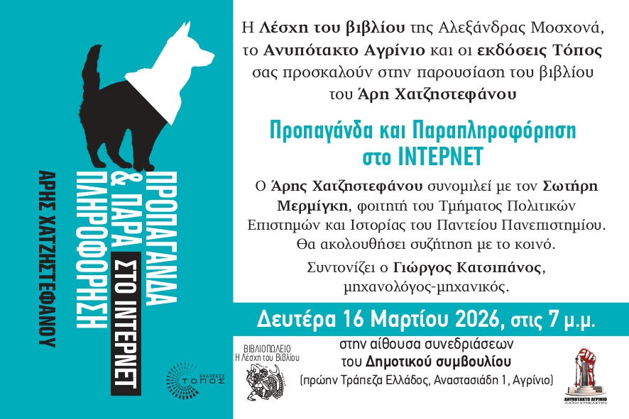 Στο Αγρίνιο η παρουσίαση του βιβλίου «Προπαγάνδα και Παραπληροφόρηση στο Internet» του Άρη Χατζηστεφάνου.