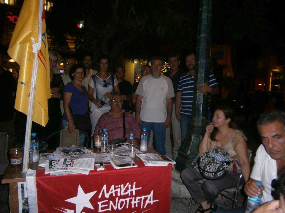 “Στη συνέχεια παρουσίασαν τις πολιτικές θέσεις της Λαϊκής Ενότητας στην Πλατεία του Λιμανιού, στέλνοντας το μήνυμα για ανατροπή των μνημονίων και απελευθέρωση από το βρόχο των τοκογλύφων, το μήνυμα για την εναλλακτική επιλογή του λαού μας και για την επιτακτική ανάγκη μιας νέας εκκίνησης για τη χώρα”.