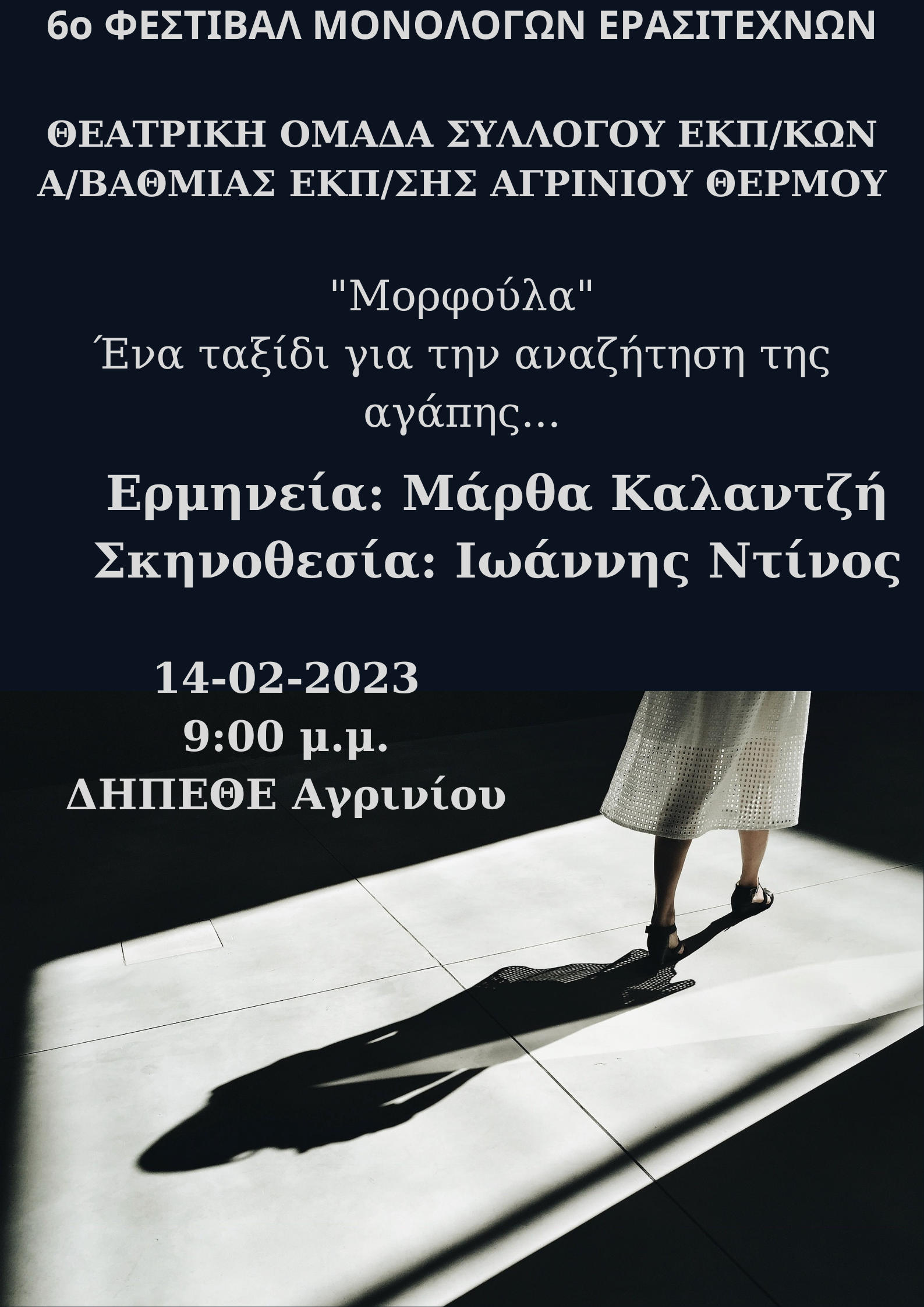 Λόγω έκτακτου προβλήματος υγείας του σκηνοθέτη της θεατρικής παράστασης “ΞΕ…ΜΕΝΟΥΜΕ ΣΠΙΤΙ” η προγραμματισμένη για το Σάββατο 18/2/2023 παράσταση του Ανοικτού Θεάτρου Αγρινίου στο Παπαστράτειο Μέγαρο ΑΝΑΒΑΛΛΕΤΑΙ. Περισσότερα