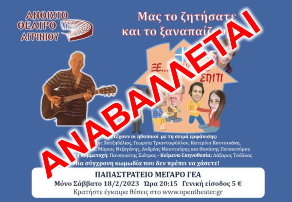 Αναβάλλεται η θεατρική παράσταση “ΞΕ…ΜΕΝΟΥΜΕ ΣΠΙΤΙ” από το ΑΝ.ΘΕ.Αγρινίου που θα γινόταν στο Παπαστράτειο Μέγαρο το Σάββατο 18/2/2023 20:15.