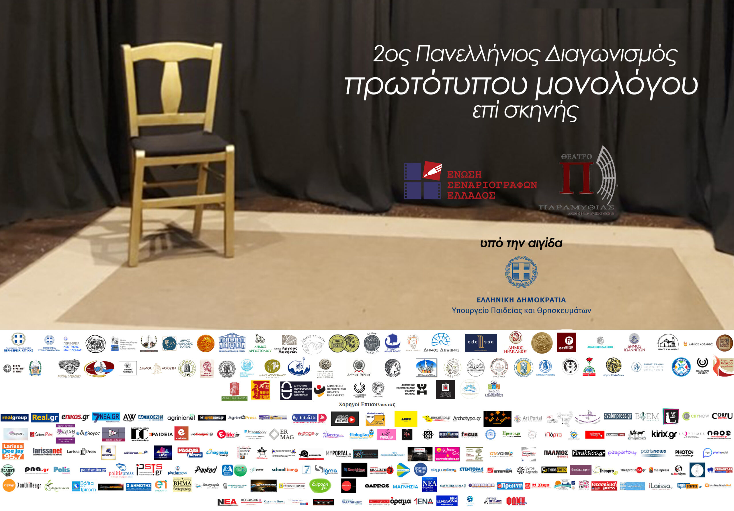 Ευκαιρία έκφρασης και καλλιτεχνικής διεξόδου σε συγγραφείς και ερμηνευτές προσφέρει ο 2ος Πανελλήνιος Διαγωνισμός Πρωτότυπων Μονολόγων επί Σκηνής που πραγματοποιεί η Ένωση Σεναριογράφων Ελλάδος και τελεί υπό την αιγίδα του Υπουργείου Παιδείας και Θρησκευμάτων και του Δήμου Αμφιλοχίας, καθώς και άλλων δήμων και πολιτιστικών φορέων από ολόκληρη την Ελλάδα.
