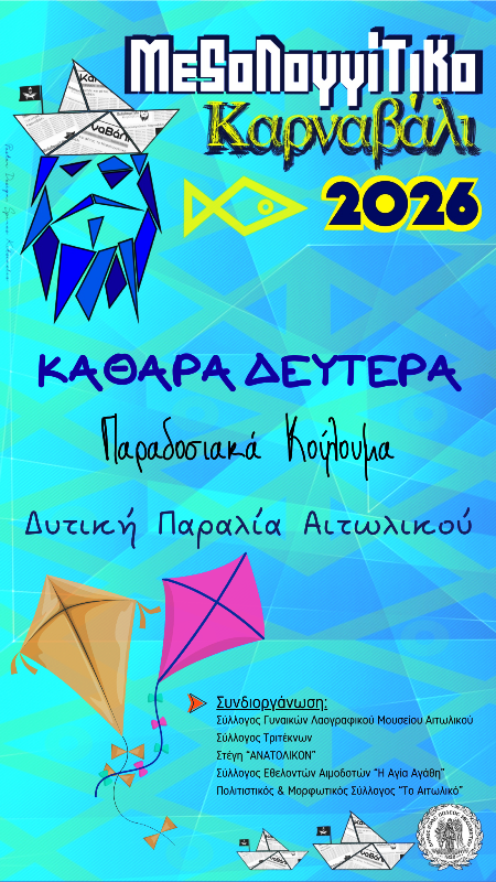 Στο πλαίσιο των αποκριάτικων εκδηλώσεων, διοργανώνεται και φέτος η γιορτή της Καθαράς Δευτέρας, στη Δυτική Παραλία Αιτωλικού, με τα καθιερωμένα παραδοσιακά Κούλουμα.