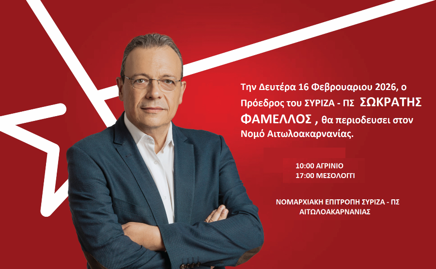 Ο πρόεδρος του ΣΥΡΙΖΑ Σωκράτης Φάμελος θα επισκεφτεί την Αιτωλοακαρνανία την Δευτέρα 16/2/26.