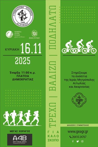 Tην Κυριακή 16 Νοεμβρίου 2025 στις 11 π.μ., η Γυμναστική Εταιρεία Αγρινίου, η Περιφέρεια Δυτικής Ελλάδας και ο Δήμος Αγρινίου, διοργανώνουν για 8η φορά το «Τρέχω, βαδίζω, ποδηλατώ», με αφετηρία και τερματισμό την Πλατεία Δημοκρατίας Αγρινίου. Περισσότερα