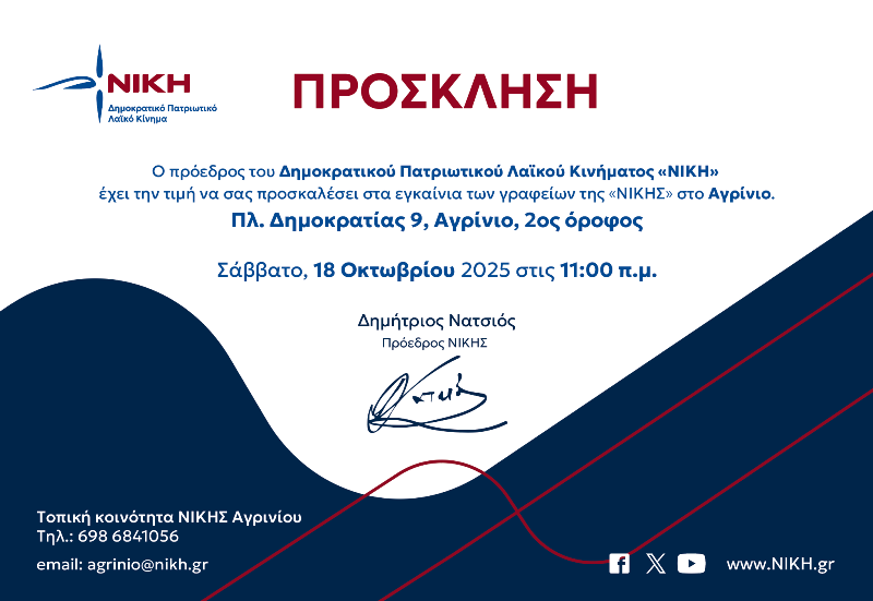 Eγκαίνια των γραφείων Αγρινίου της ΝΙΚΗΣ, που θα πραγματοποιηθούν το Σάββατο 18 Οκτωβρίου 2025 και ώρα 11:00, στην διεύθυνση Πλατεία Δημοκρατίας 9, 2ος Όροφος.