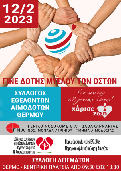 Ο Σύλλογος Εθελοντών Αιμοδοτών (ΣΕΑ) Θέρμου, σε συνεργασία με τον Σύλλογος Εθελοντών Αιμοδοτών-Δωρητών Οργάνων Σώματος (ΣΕΑ-ΔΟΣ) Αιτωλοακαρνανίας σας καλεί στην εθελοντική συλλογή δειγμάτων σιέλου για να γίνετε Δότες Μυελού των Οστών, την Κυριακή 12 Φεβρουαρίου 2023 στο Θέρμο.