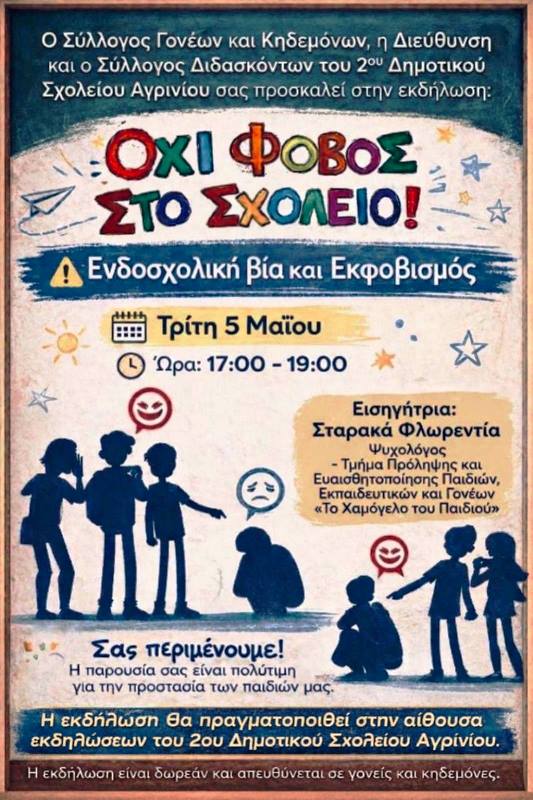 Ο Σύλλογος Γονέων και Κηδεμόνων, η Διεύθυνση και ο Σύλλογος Διδασκόντων του 2ου Δημοτικού Σχολείου Αγρινίου διοργανώνουν ενημερωτική εκδήλωση με θέμα «Όχι Φόβος στο Σχολείο! – Ενδοσχολική Βία και Εκφοβισμός», την Τρίτη 5 Μαΐου και ώρα 17:00 – 19:00, στην αίθουσα εκδηλώσεων του σχολείου.