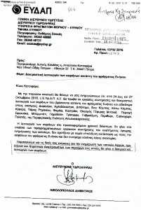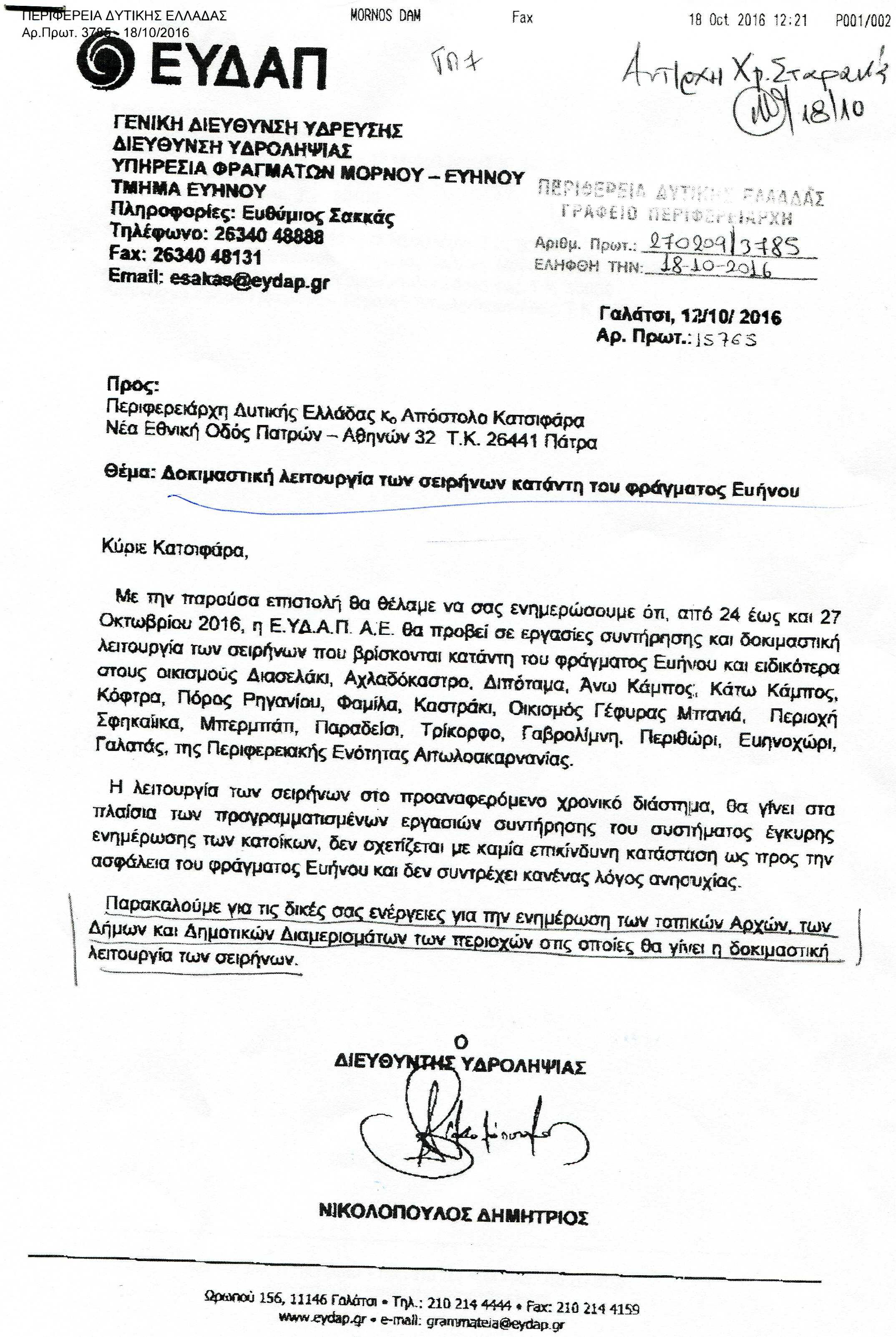 Από 24 έως 27 Οκτωβρίου 2016 η Ε.Υ.Δ.Α.Π θα προβεί σε εργασίες συντήρησης και δοκιμαστικής λειτουργίας των σειρήνων που βρίσκονται κατάντη του φράγματος Ευήνου και στους γύρω οικισμούς .