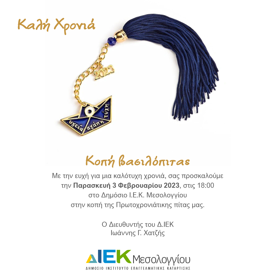 Φέτος, έχουμε τη δυνατότητα να σας καλέσουμε στην κοπή της βασιλόπιτας του ΙΕΚ για το 2023, που θα πραγματοποιηθεί την Παρασκευή 3 Φεβρουαρίου 2023, στην αίθουσα εκδηλώσεων στο ΔΙΕΚ Μεσολογγίου.