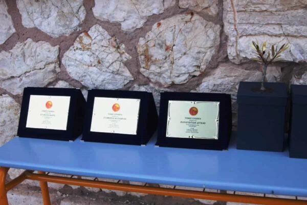 Ακολούθησαν χαιρετισμοί από τον Πρόεδρο του Πολιτιστικού Κέντρου Τηλέμαχο Καραϊσκάκη και τον επιμελητή κο Νώντα Σαρλή και στη συνέχεια πραγματοποιήθηκαν βραβεύσεις στους τιμώμενους καλλιτέχνες Μαρία Σταμάτη, Γεώργιο Σταθόπουλο και Άγγελο Παναγιωτίδη, ενώ απονεμήθηκαν αναμνηστικά πρωτότυπα γλυπτά έργα ελιάς, από μπρούτζο και χαλκό, προσφορά του καλλιτέχνη Άγγελου Παναγιωτίδη.