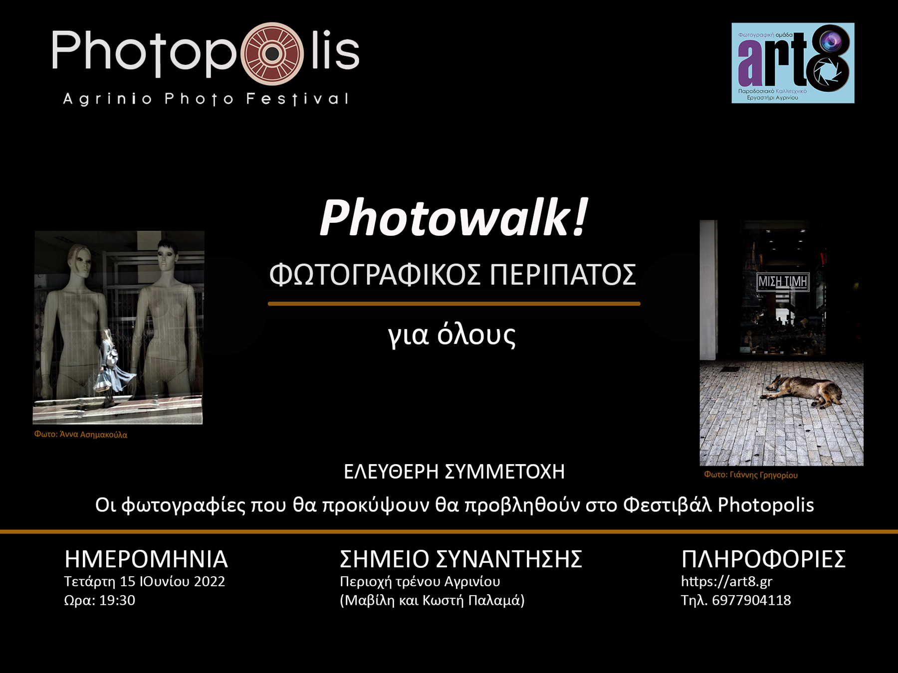 Το Photopolis Agrinio Photo Festival θέλοντας να τιμήσει την φωτογραφική ομάδα “art8”, η οποία συμπληρώνει 10 χρόνια συνεχούς παρουσίας στα πολιτιστικά δρώμενα του Αγρινίου, διοργανώνει φωτογραφικό περίπατο την Τετάρτη 15 Ιουνίου 2022 στο Αγρίνιο, παρέα με τα μέλη της “art8”.