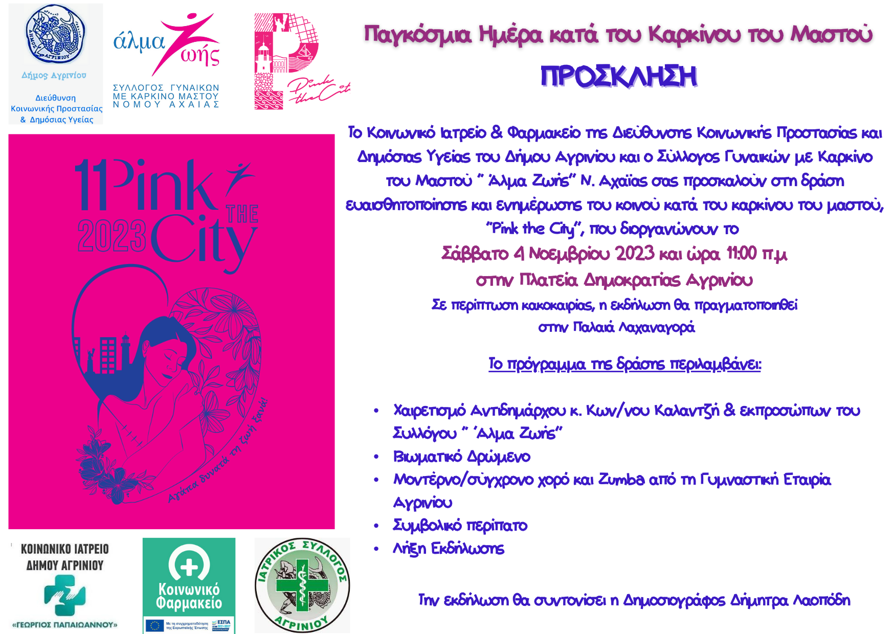Το Κοινωνικό Ιατρείο και Φαρμακείο της Διεύθυνσης Κοινωνικής Προστασίας και Δημόσιας Υγείας του Δήμου Αγρινίου και ο Σύλλογος Γυναικών με Καρκίνο του Μαστού «Άλμα Ζωής Ν. Αχαΐας» διοργανώνουν για 4η συνεχόμενη χρονιά τη δράση “Pink the City”.